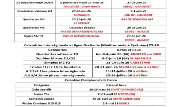 DOUBLE Week end de championnat de France Doubles a St Chef (69) avec 2 representants catalans Equipe Cunado (BSL) en F3 et l’equipe Lambert ( Claira ) en M3 Vous pouvez suivre les résultats durant ces 2 jours de competition QUADRETTE Bonne chance aux 3 équipes catalanes qui joueront le […]